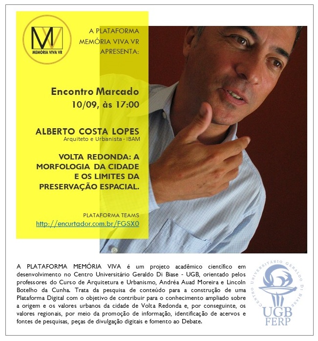 Apresentou leitura de texto, contextualizando o seu objeto de pesquisa centrado em Volta Redonda, como cidade planejada, patrimônio cultural, e os desafios dessa cidade para o século XXI.